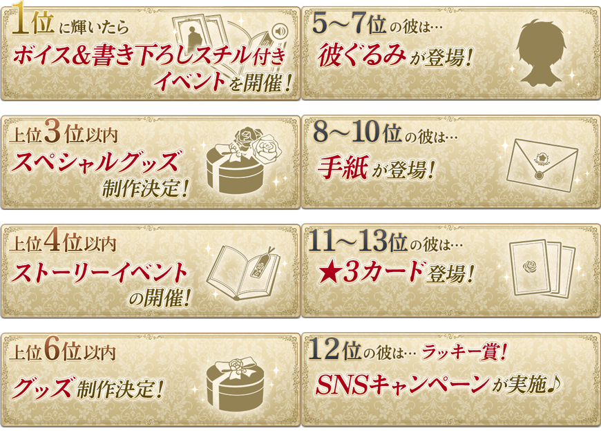 投票方法:本編ストーリーを読み進めたり、ミニゲームをプレイすることで、「投票券」が獲得でき、気になる彼に投票ができます。また、投票数に応じて豪華な特典を獲得できます。