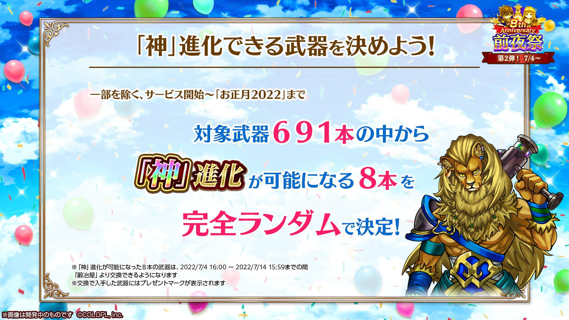YouTubeで放送された「白猫おせニャん NEW WORLD’S 第15回」内にて、8本の武器の「神」進化が決定し、その実装が「8周年前夜祭キャンペーン 第2弾」で行われます。