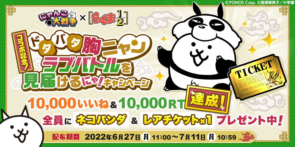 ポノス株式会社(本社:京都府京都市、代表取締役:辻子依旦、以下「ポノス」)は同社のスマートフォン向けゲームアプリ「にゃんこ大戦争」において、株式会社 小学館(東京都千代田区一ツ橋2-3-1)発行、少年サンデーコミックスにて連載されていた高橋留美子作の人気漫画『らんま1/2』とのコラボレーションイベントを2022年6月27日(月)11:00より開始いたしましたので、これをお知らせいたします。