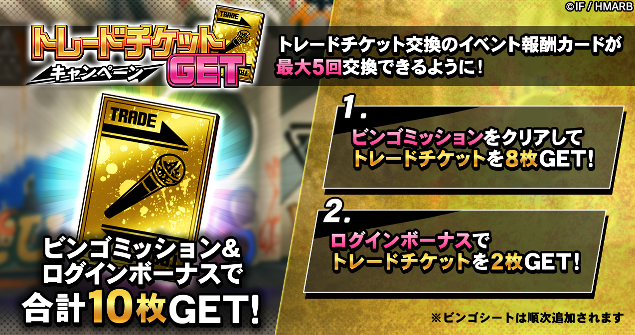 期間中、トレードチケットを最大10枚獲得出来るビンゴミッションやログインボーナスなどを開催しています。詳細はアプリ内お知らせをご確認ください。