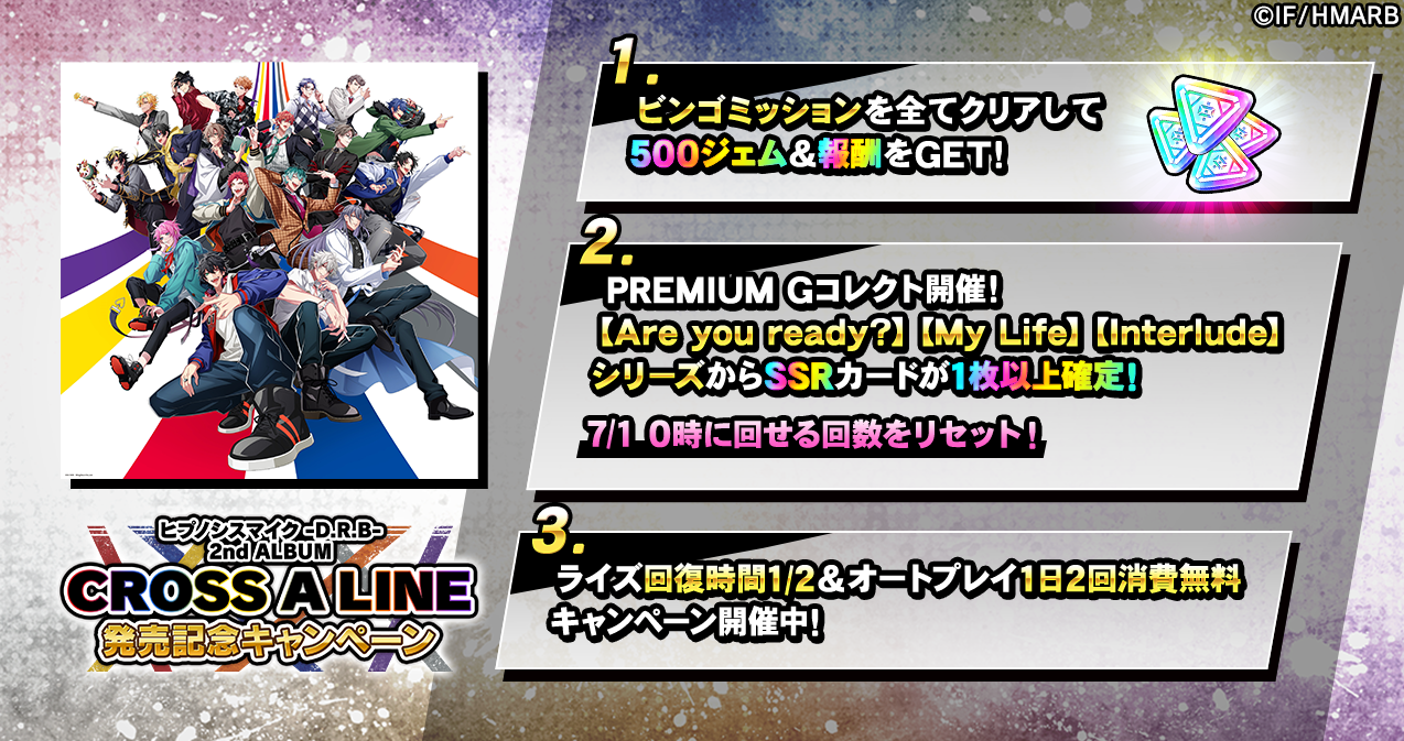 ヒプノシスマイク -Division Rap Battle- 2nd ALBUM『CROSS A LINE』の発売を記念して、新曲『CROSS A LINE』が期間限定でKILLER SCRATCH!!にてプレイ出来るほか、限定ビンゴミッションやPREMIUM Gコレクト、ログインボーナスなどを開催しています。詳細はアプリ内お知らせをご確認ください。