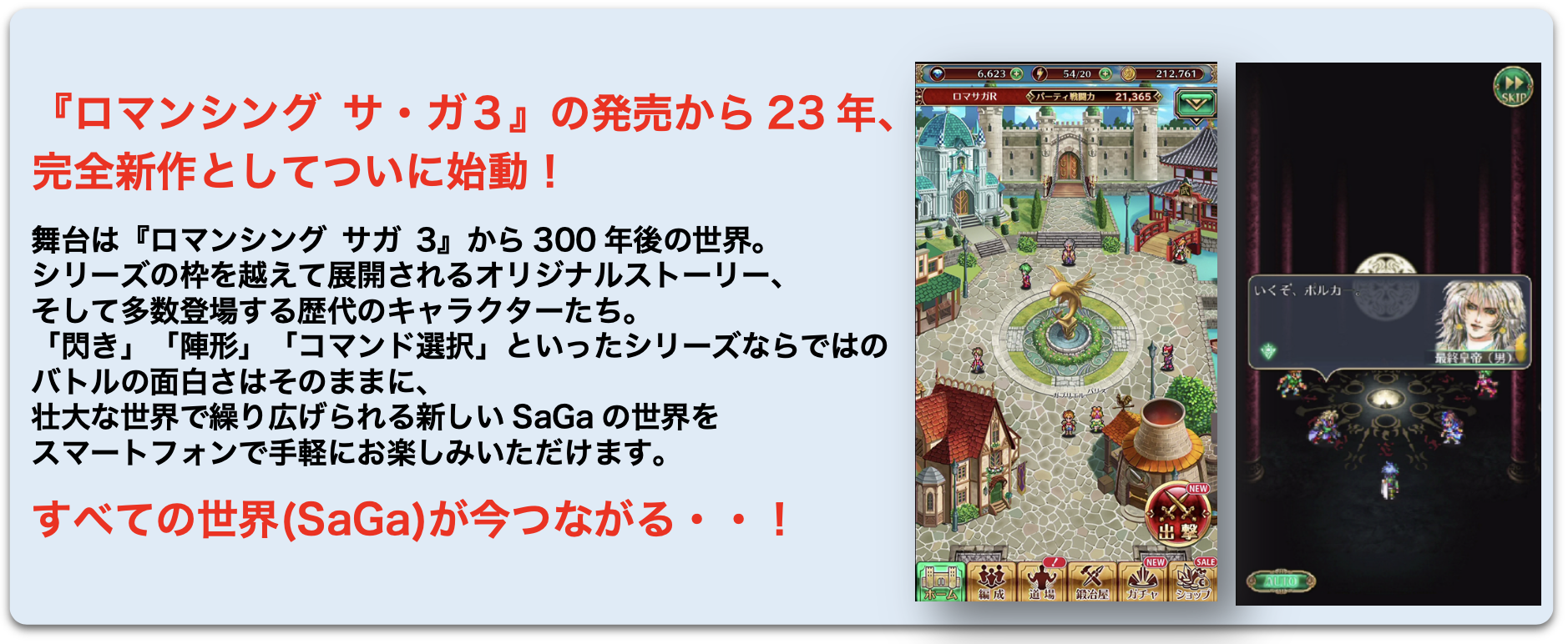 なお、「ロマンシング サガ リ・ユニバース」は、アカツキとスクウェア・エニックスとの共同開発による、23 年ぶりとなる「ロマンシング サガ」完全新作の新規ゲームアプリです。