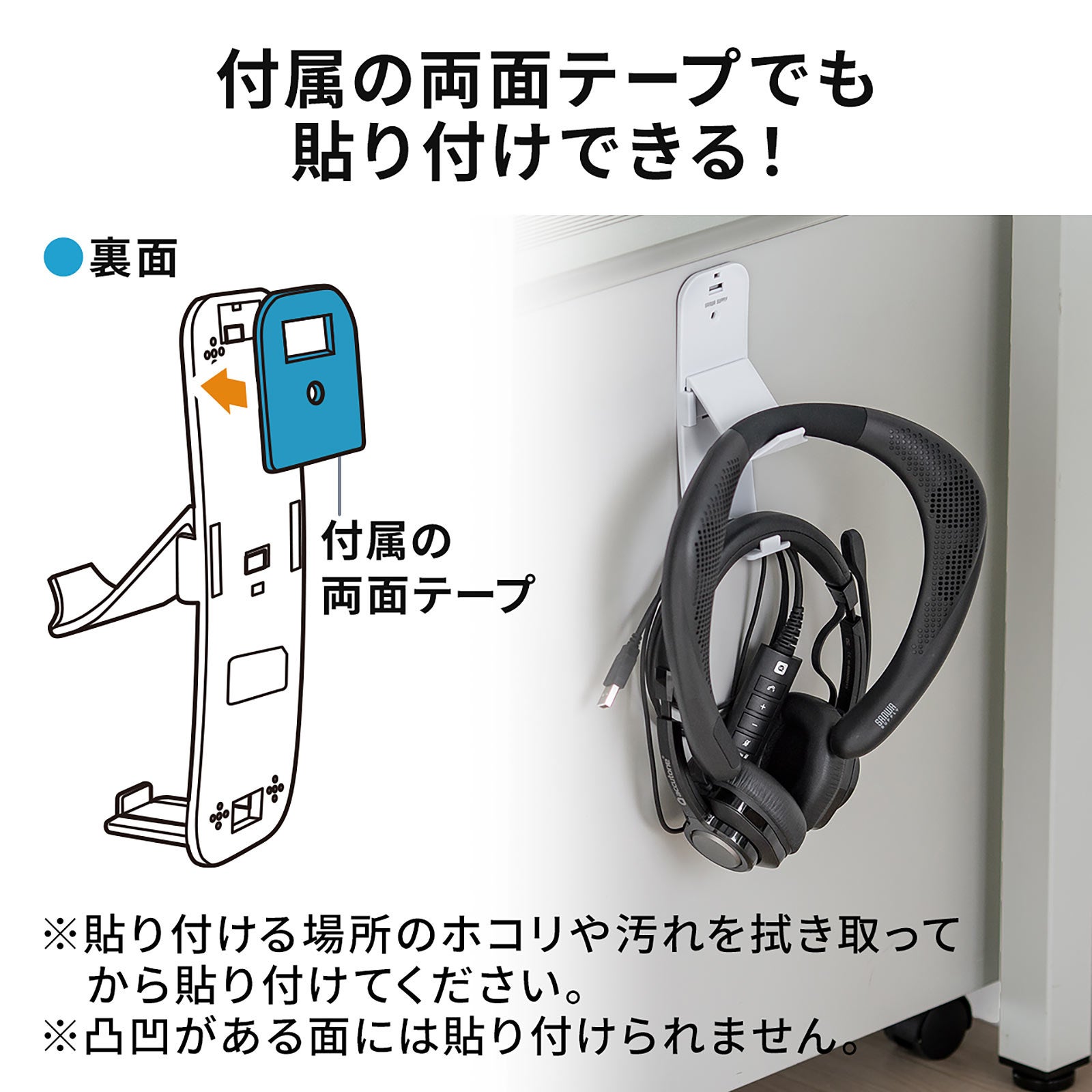 付属の両面テープを使ってキャビネットや液晶モニターの裏など好きな場所に貼り付けて使うこともできます。