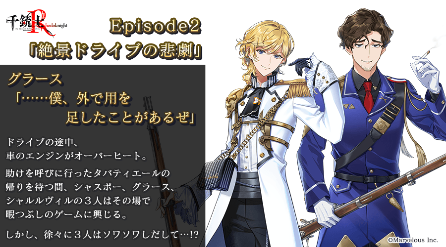 株式会社マーベラス(代表取締役社長:佐藤 澄宣/所在地:東京都品川区)による、スマートフォンゲーム『千銃士:Rhodoknight』(読み:せんじゅうし ろーどないと 以降、『千銃士R』)は、シャスポー(江口拓也)とグラース(寺島拓篤)のキャラクターソングやオーディオドラマが収録されているCD「Crossing Emotions volume III シャスポー♰グラース」を本日発売いたしました。また、同CDに収録されているシャスポー(CV:江口拓也)による楽曲「odd Macaron」、グラース(CV:寺島拓篤)による楽曲「Fake to Face」のリリックビデオを公開いたしました。