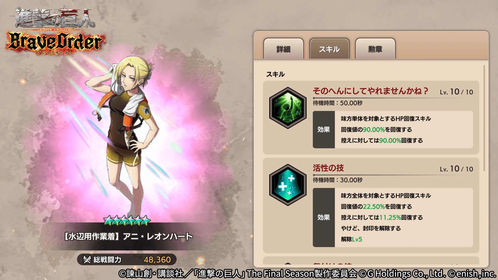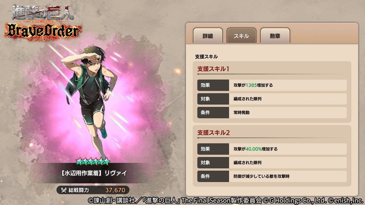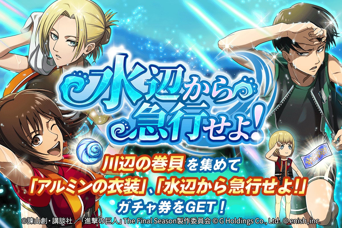 株式会社enish(本社:東京都港区、代表取締役社長:安徳 孝平、以下enish)は、アニメ『進撃の巨人』のスマートフォンゲーム最新作「進撃の巨人Brave Order」にて、新イベント「水辺から急行せよ!」を開催!イベントアイテムの「川辺の巻貝」を集めて豪華報酬をGETしよう!また、本日より新登場の【水辺用作業着】アニ・レオンハート、【水辺用作業着】サシャ・ブラウス、【水辺用作業着】リヴァイがピックアップされた「水辺から急行せよ!ガチャ」も同時開催!更に、第3回公式生放送にて決定したアンケートログインボーナスを開催!更に更に、新作オリジナルグッズが当たるキャンペーンも開催!その他、最新情報はゲーム公式サイト・ゲーム公式Twitterアカウントにて随時公開して行きますので、ぜひご覧ください。