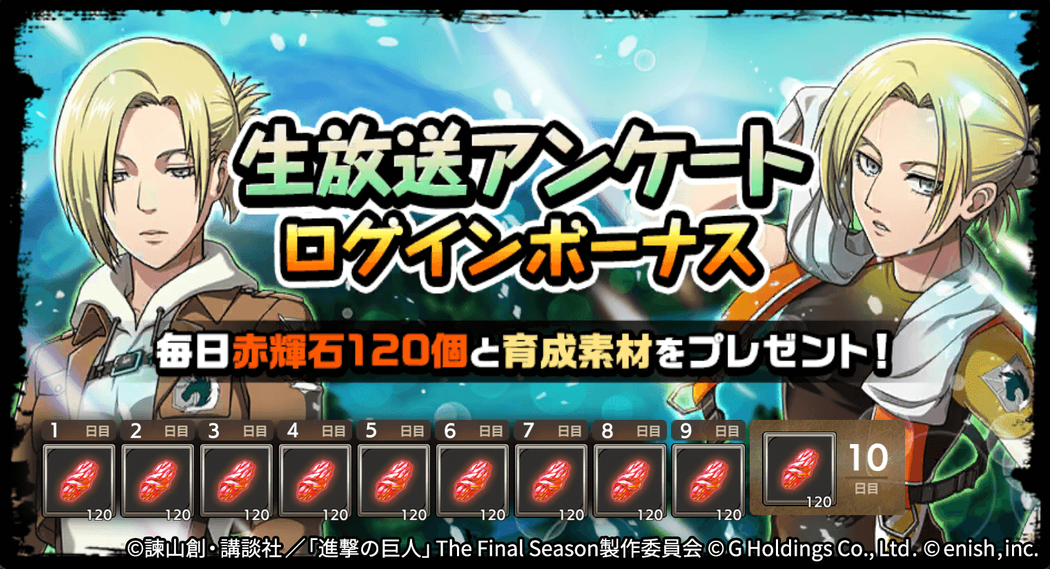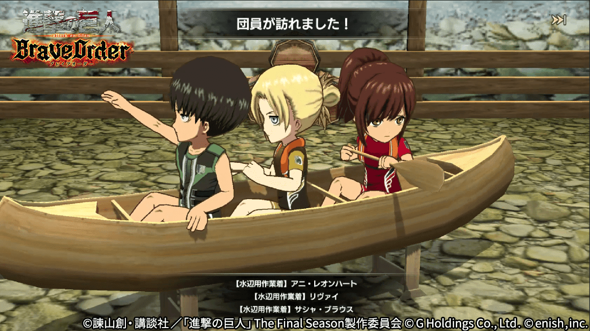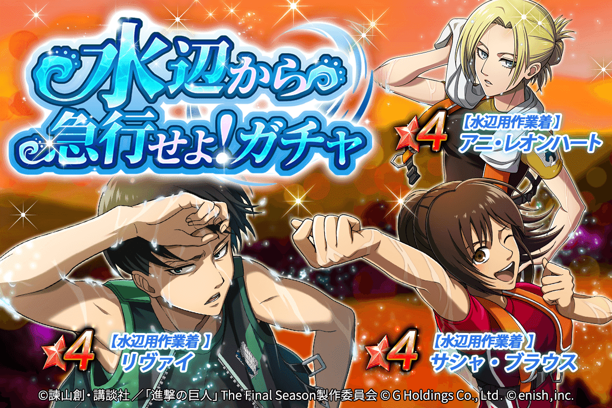 株式会社enish(本社:東京都港区、代表取締役社長:安徳 孝平、以下enish)は、アニメ『進撃の巨人』のスマートフォンゲーム最新作「進撃の巨人Brave Order」にて、新イベント「水辺から急行せよ!」を開催!イベントアイテムの「川辺の巻貝」を集めて豪華報酬をGETしよう!また、本日より新登場の【水辺用作業着】アニ・レオンハート、【水辺用作業着】サシャ・ブラウス、【水辺用作業着】リヴァイがピックアップされた「水辺から急行せよ!ガチャ」も同時開催!更に、第3回公式生放送にて決定したアンケートログインボーナスを開催!更に更に、新作オリジナルグッズが当たるキャンペーンも開催!その他、最新情報はゲーム公式サイト・ゲーム公式Twitterアカウントにて随時公開して行きますので、ぜひご覧ください。