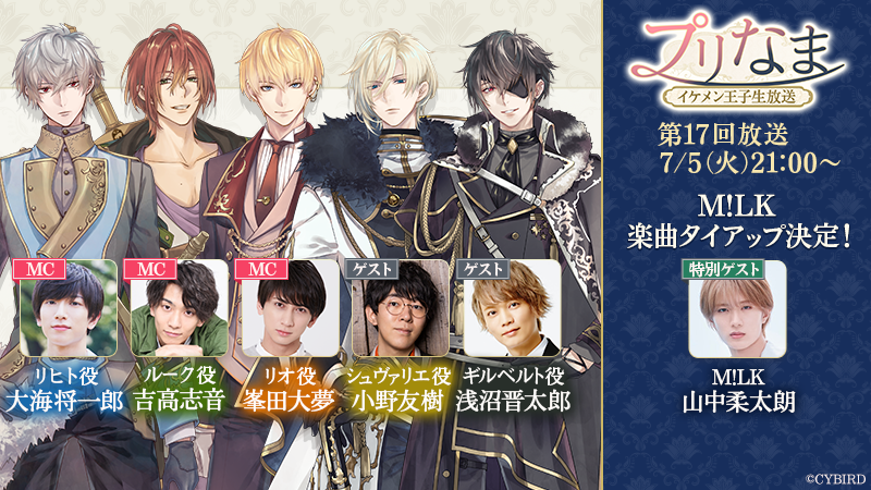 『イケメン王子 美女と野獣の最後の恋』の生放送番組「プリなま」の2周年記念配信が決定しました。MCに「リヒト=クライン」役の大海 将一郎さん、「ルーク=ランドルフ」役の吉高 志音さん、「リオ=オルティス」役の峯田 大夢さん、ゲストには「シュヴァリエ=ミシェーレ」役の小野 友樹さん、「ギルベルト=フォン=オブシディアン」役の浅沼 晋太郎さんに加え、タイアップが決定している「M!LK」のメンバーの山中 柔太朗さんを特別ゲストとしてお迎えします。