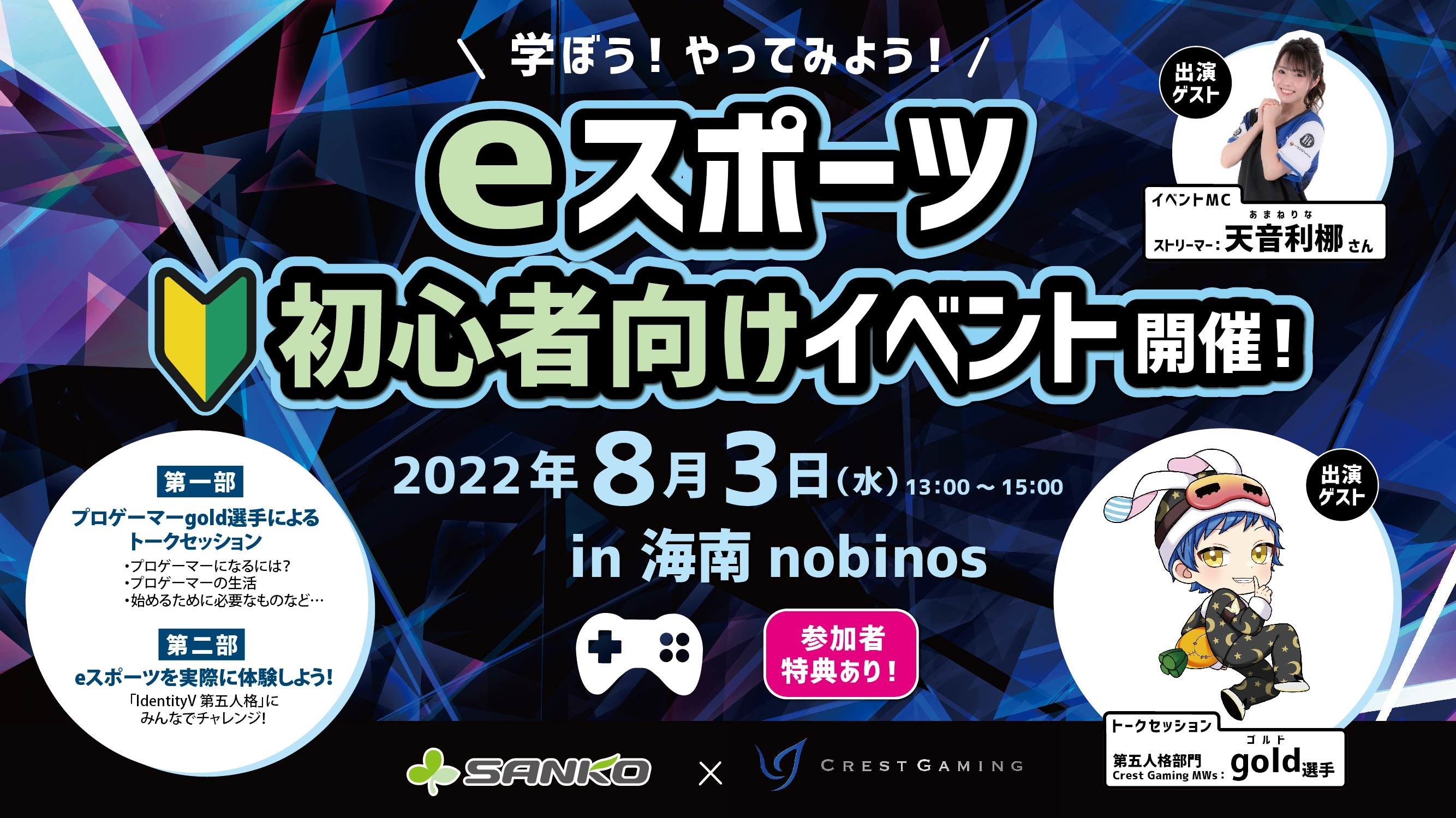 生活サポート用品を開発、製造、販売する株式会社サンコー(本社:和歌山県海南市/代表取締役:角谷太基)は、ヒューマンアカデミー株式会社のマルチプロゲーミングチーム「Crest Gaming」のサポーターとして、和歌山県内の中学生・高校生を対象に、eスポーツ初心者向けの体験イベントを、2022年8月3日(水)に海南nobinos(和歌山県海南市日方1525-6)にて実施いたします。