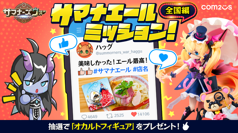 スマートフォン向けモバイルゲームをサービスしている株式会社Com2uS Japanは、iOS/Androidで大好評配信中の本格RPG『サマナーズウォー: Sky Arena』(以下、 サマナーズウォー)と召喚士のお店がコラボする「サマナエールプロジェクト」シーズン2第3弾として、全国編の開始をお知らせします。