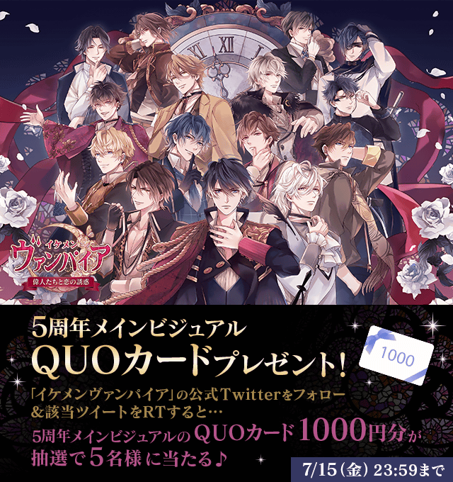 5周年を記念して、公式Twitter(https://twitter.com/IkemenVampire)をフォローのうえ該当ツイートをRTいただくと、5周年メインビジュアルのQUOカード(1,000円分)が抽選で【5名様】に当たるキャンペーンを実施します。