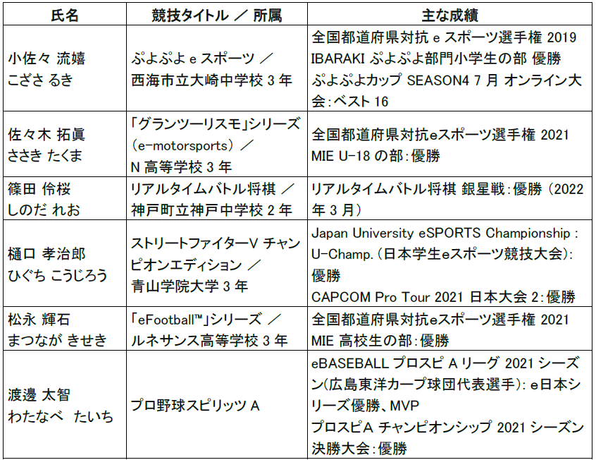eスポーツ選手が「スポーツ選手支援事業」の対象として選定されるのは、昨年に引き続き2年連続となります。今回新たに支援対象に選定された選手は、JeSUライセンス公認タイトルの公式大会などで優秀な成績を収めた6名です。