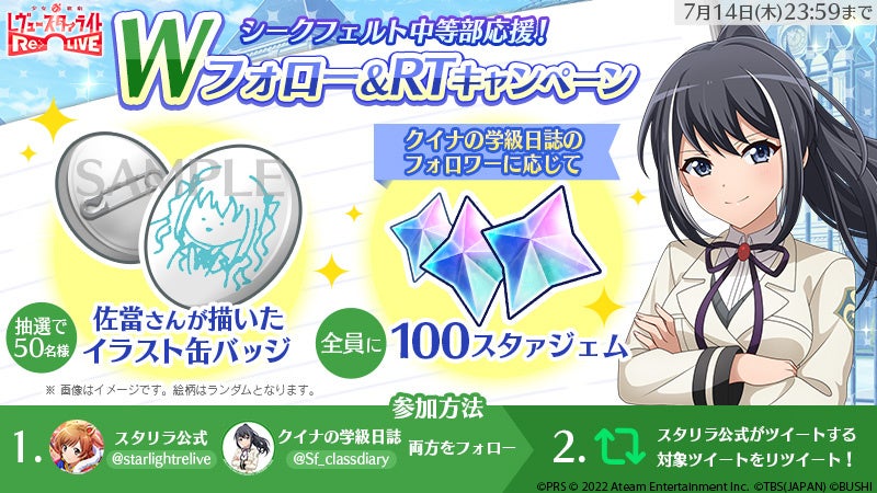 『スタリラ』公式Twitter(@starlightrelive)と、シークフェルト音楽学院中等部の情報をお届けするアカウント「クイナの学級日誌」(@Sf_classdiary)の両方をフォローし、『スタリラ』公式Twitter(@starlightrelive)が投稿する対象ツイートをリツイートして応募してください。缶バッジの絵柄はランダムとなります。