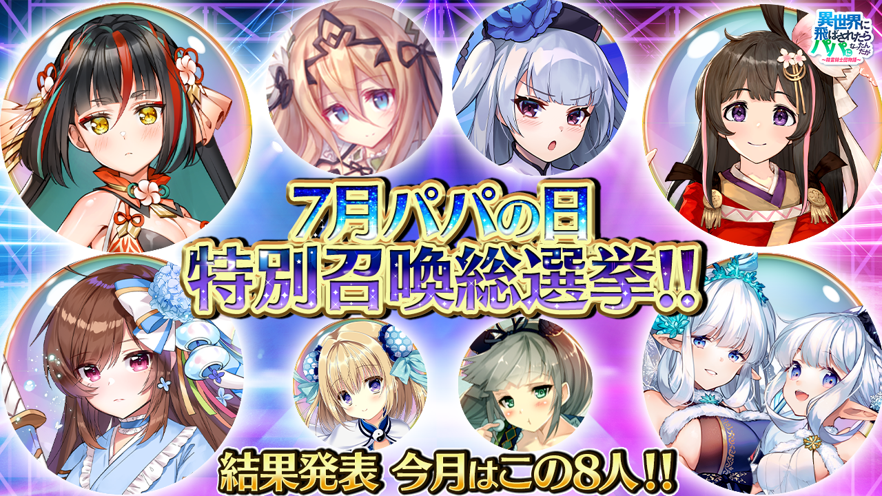 7月の厳選8キャラUR召喚イベントは、 先日ユーザーの皆様にご投票いただいた「特別召喚総選挙」で上位8名になったURキャラを集めました。