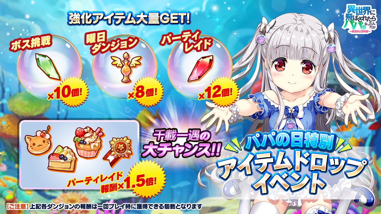7月8日のパパの日では、 パパの日恒例の全ユーザーにジェム888個プレゼント、 1日限定のパパの日パッケージの販売、 アイテムドロップイベント、