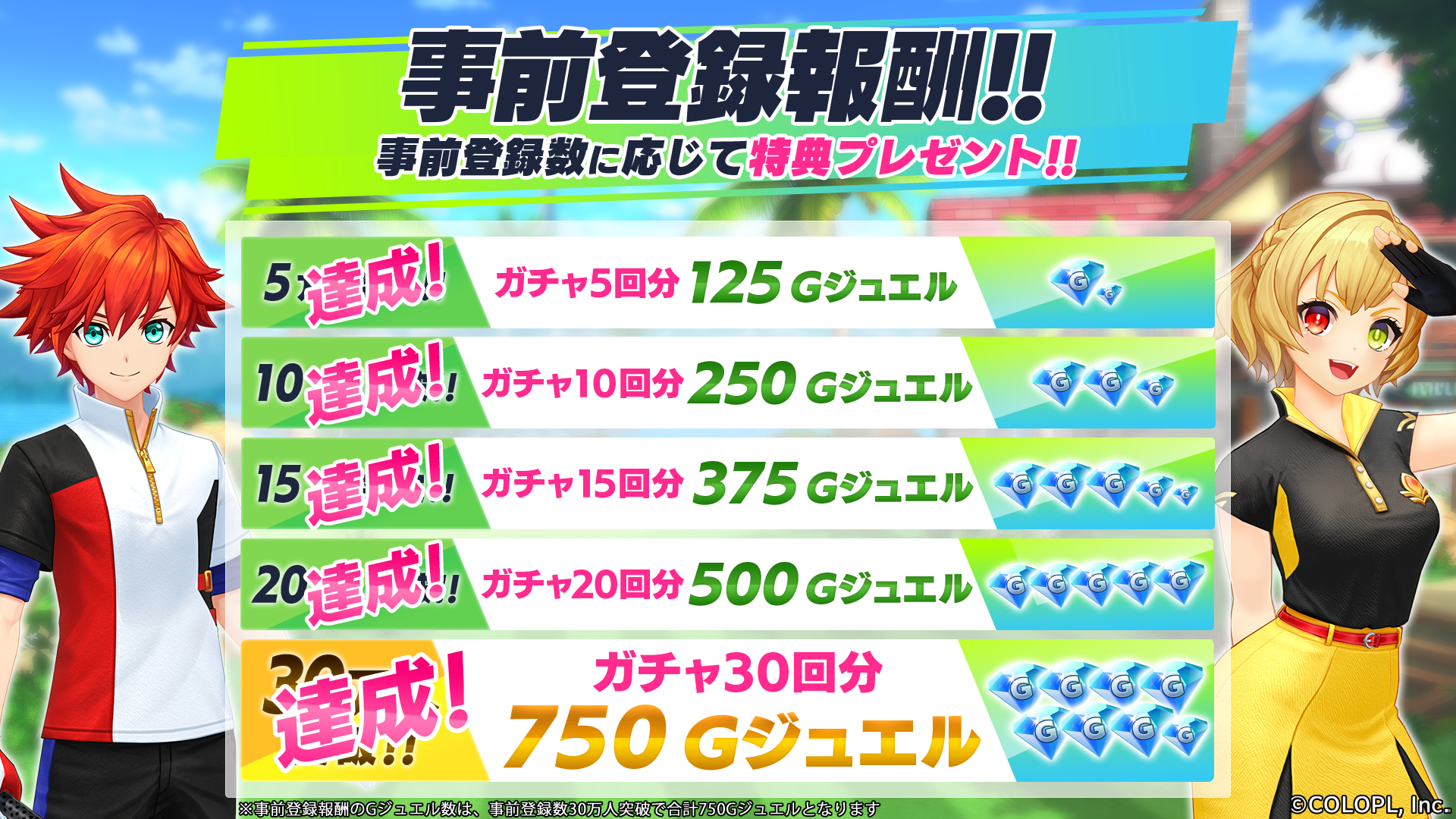 事前登録数が30万人を突破した特典として、ガチャ30回分となる「750Gジュエル」のプレゼントが確定いたしました。プレゼントは、正式サービス開始後にログインした全プレイユーザーに配布されます。