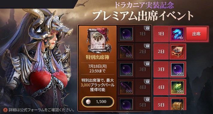 合計で500ブラックパールや[混沌]遺物箱、ドラゴンの炎等が手に入る出席簿イベントとなっており、1500パールを消費する事で特別出席簿も貰うことがき、全て獲得すると3000ブラックパールや影の紐1000個が手に入ります!