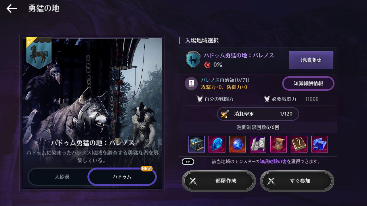 ハドゥム:勇猛の地はバレノス地域からメディア北部までの8つの地域が対象となっており、光の聖水を消費して週6回まで入場する事ができます。