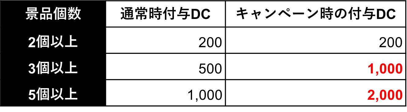 今回の『今だけ!まとめて配送でDC2倍プレゼント!』キャンペーンでは、3つ以上の景品をまとめて配送していただいたお客様に期間限定で通常時の2倍のDCを付与いたします。