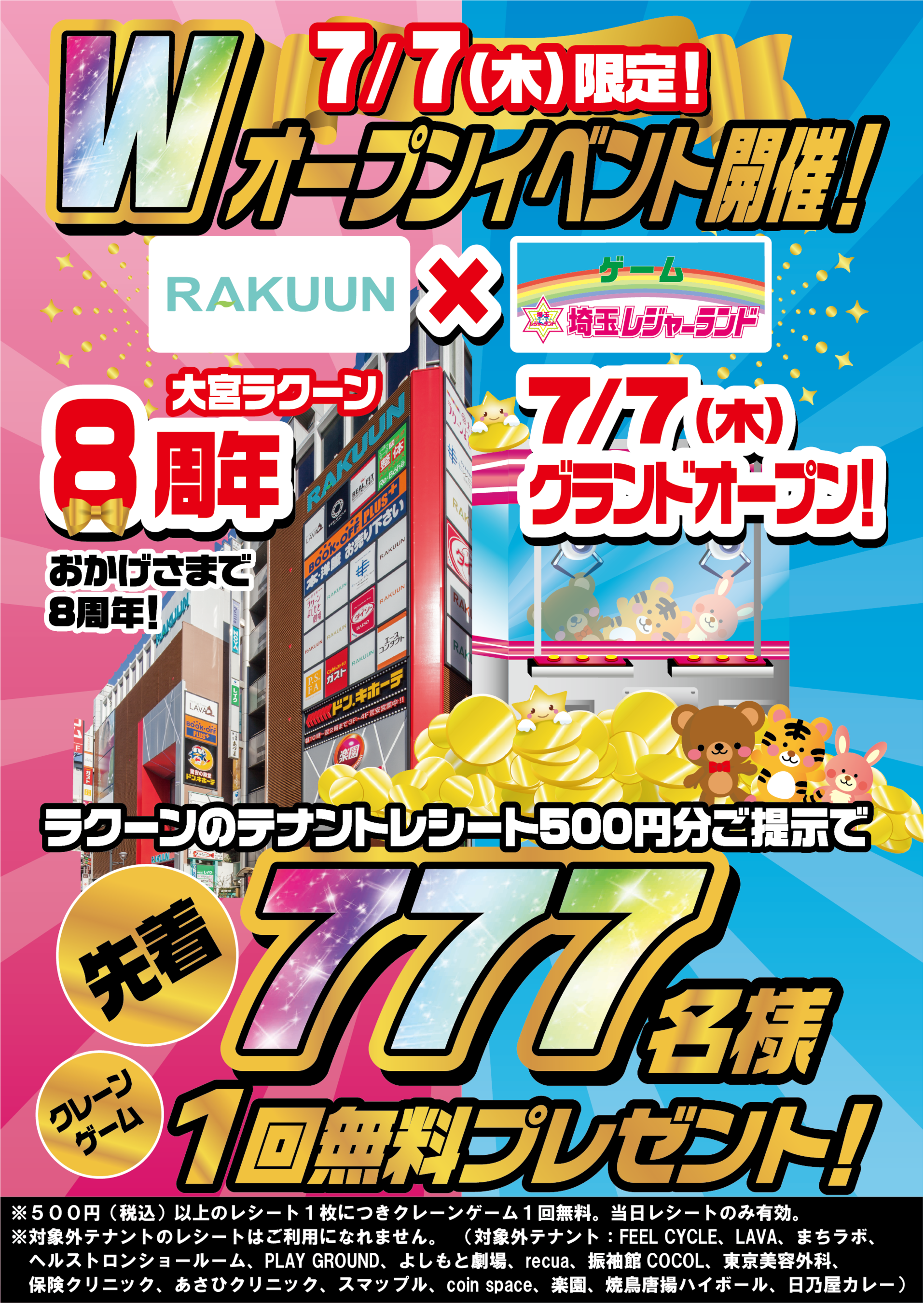 大宮ラクーン内のテナントで、500円(税込)以上ご利用のレシートをお持ちのお客様、先着777名様にクレーンゲーム1回無料券をプレゼントいたします。