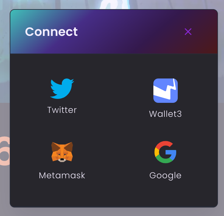 - 右上の接続ボタン(Connect )でWallet3またはMetamaskウォレットに接続。