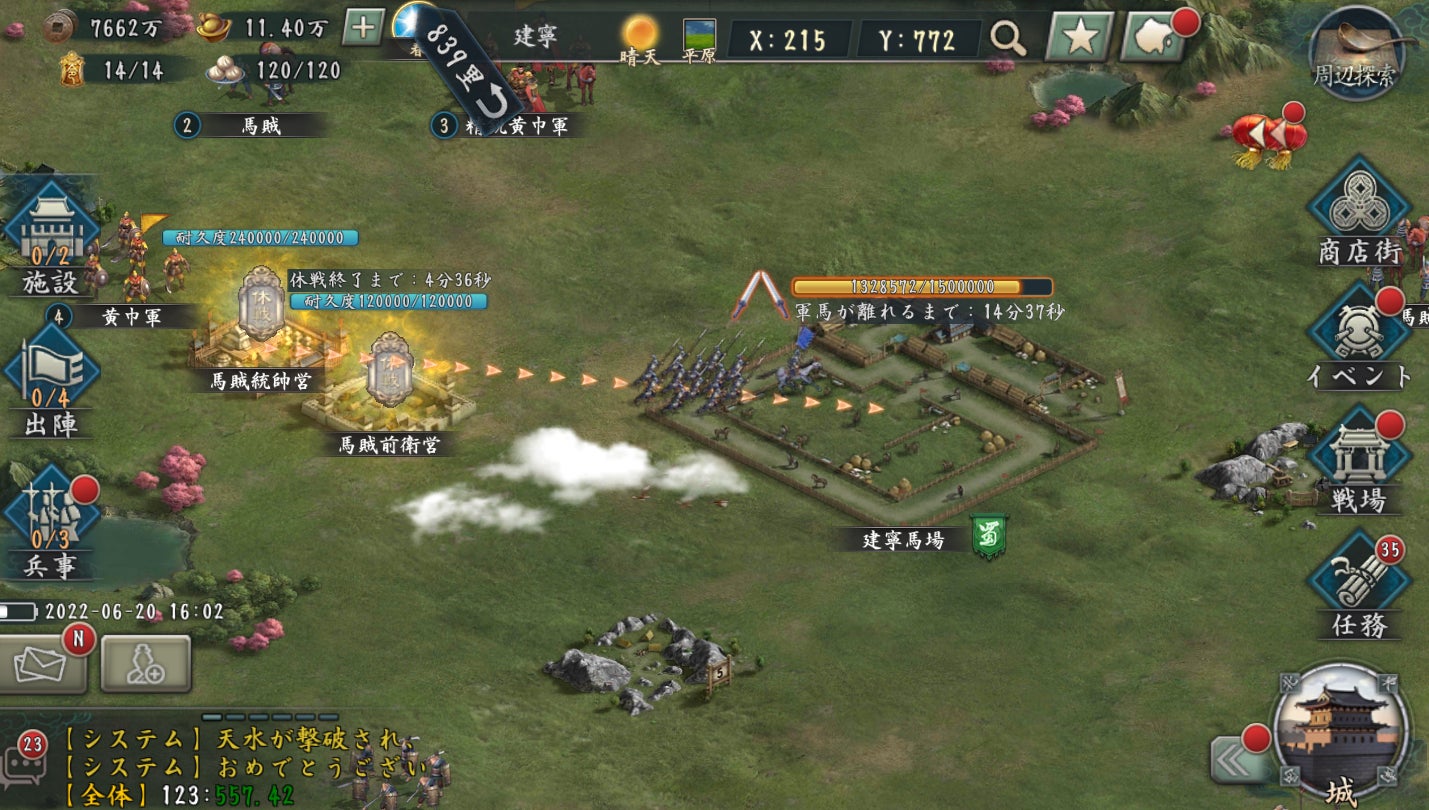 護送段階では、馬商が集めた軍馬を引き連れて三つの馬場を経由します。馬場に滞在している間は、他国のプレイヤーや馬賊に攻撃されますので、自国のプレイヤーと共に軍馬を守り抜く必要があります。