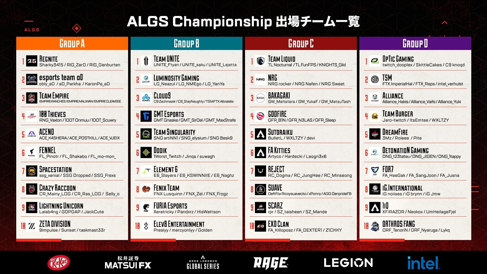 『ALGS Championship』は、ALGS year2を締めくくる大会であり、世界のトップ40チームが参加し、アメリカノースカロライナ州ローリーより4日間にわたって開催いたします。2回目となる今年の大会は、約2年ぶり、そして「Apex Legends」史上最大規模での開催となります。