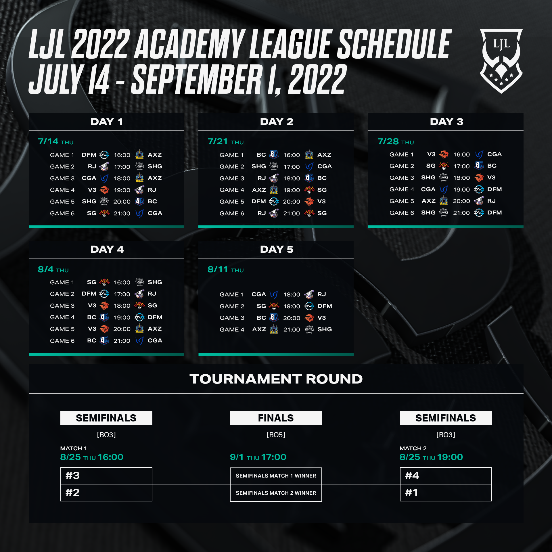 「LJL Academy League」はLJLの次世代を担う選手の育成の場と、競技シーンの発展を目的として今シーズンも7月14日(木)より開幕いたします。LJL出場の8チームのアカデミー所属選手による全チーム総当たりの5日間のレギュラーシーズンとトーナメントラウンドを以下の日程で実施いたします。優勝チームには賞金200万円が与えられます。全ての試合はオンライン形式にて開催され、LJL配信プラットフォームでご視聴いただけます。