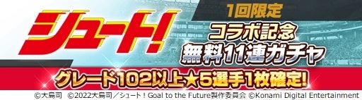 また「グレード102以上★5選手」が1枚確定で手に入る「シュート!コラボ記念無料11連ガチャ」や、コラボカードが入手できる特別なイベントを開催します。