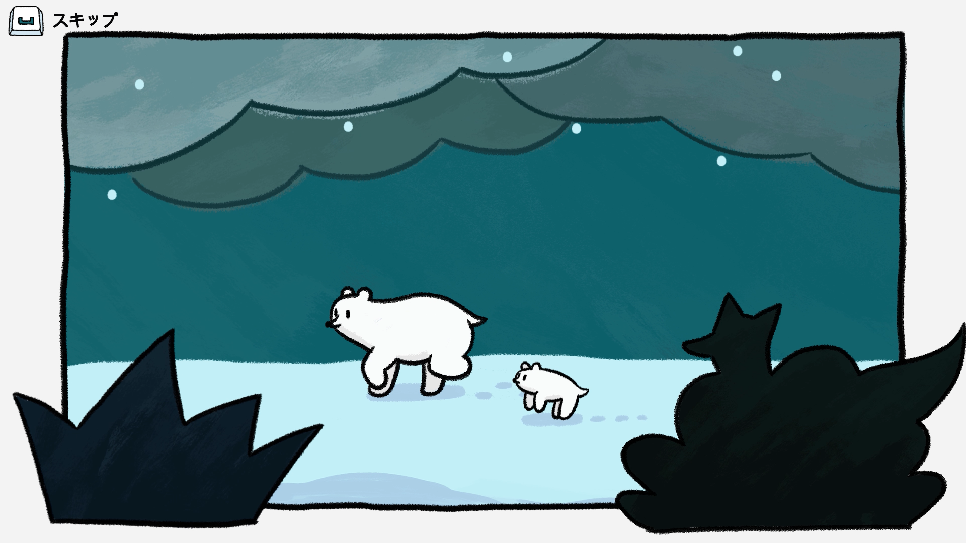 親シロクマを動かすたびに足元の氷がどんどん溶けてしまうので、溶けきる前に次の氷に飛び移って、子グマのもとへたどり着きましょう。ゲームは全部で150ステージ。時間制限はありませんので、じっくりルートを探って氷を動かしましょう。手描き絵本のようなかわいらしいイラストが織りなすユニークで魅力的な北極の世界。シロクマの親子だけでなく、アザラシや海鳥も登場しますよ。