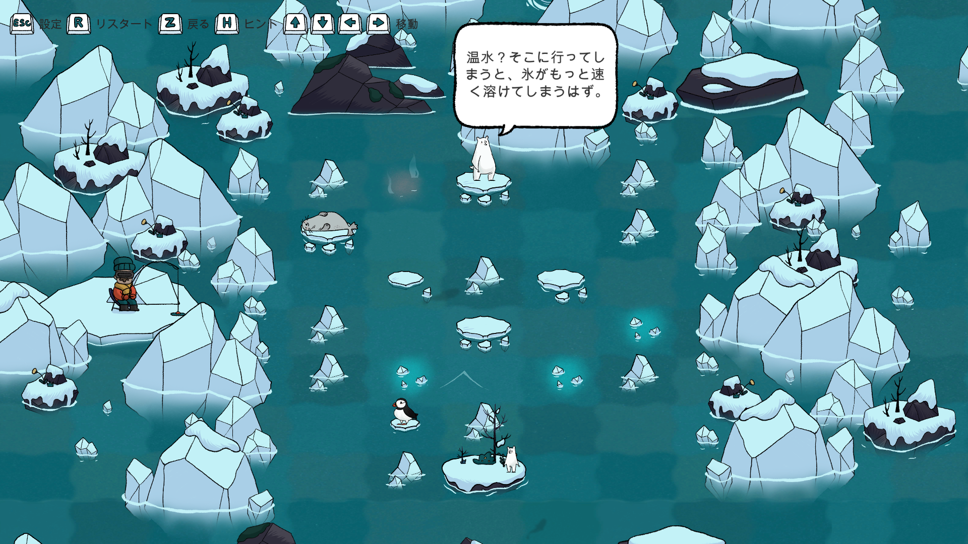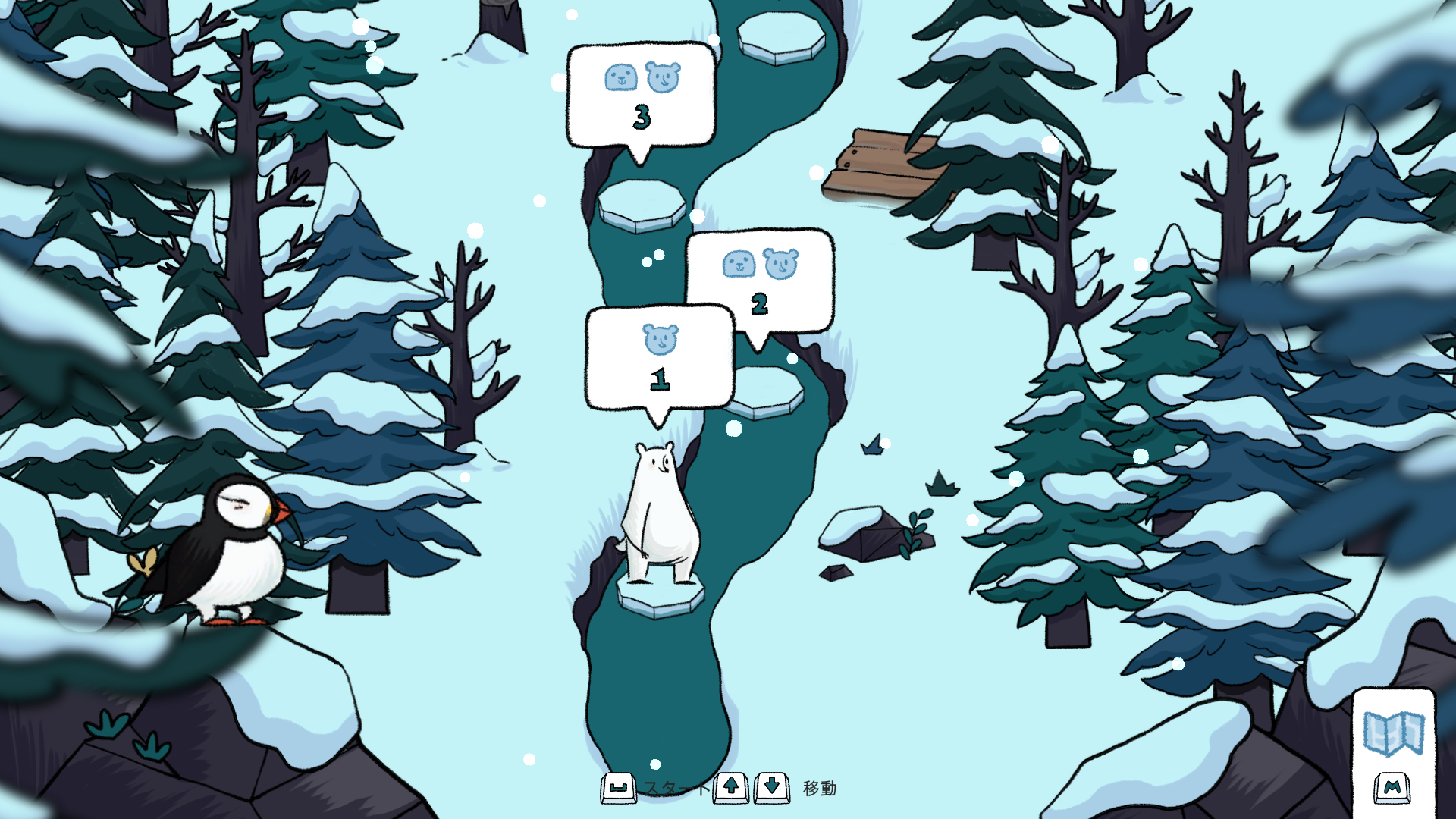 ポーラトピアは、北極の氷の海を舞台にしたパズルゲームです。親のシロクマが子グマを助けに行けるようルートを考えましょう。