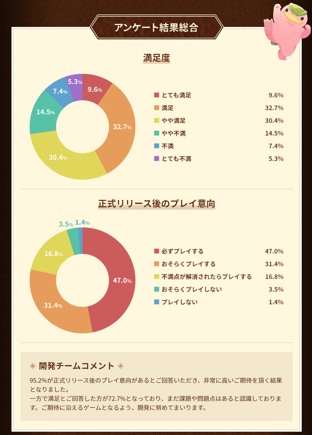 95%以上の方に「正式リリース後のプレイ意向がある」とご回答いただきました。一方で「内容に満足」とご回答した方は72.7%となっており、まだ課題があると認識しております。ご期待に沿えるよう、チーム一同、開発に取り組んでまいります。その他、レポート公開ページで各項目を詳しくご紹介しております。