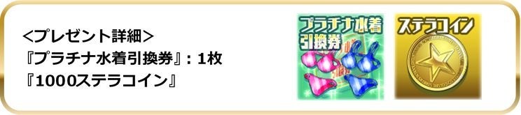 キャンペーン期間中、ログインしたプレイヤー全員に「新作水着売り場」にて好きな女の子の《水着2022》メモカと交換ができる「プラチナ水着引換券」と「1000ステラコイン」をプレゼント!
