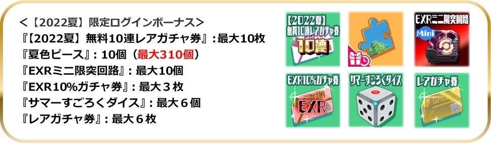 ※期間中累計59日間ログインした場合に、「【2022夏】無料10連レアガチャ券」の10枚目を入手できます。