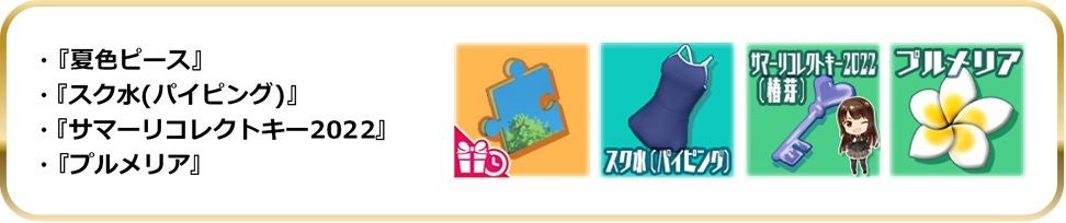お気に入りの女の子に一定数プレゼントすると、2022年夏限定コスチューム「スク水(パイピング)」や、ショップで様々な豪華アイテムと交換できる限定アイテム「プルメリア」、後日「夏色ピース」を渡した女の子との《夏の思い出エピソード》を解放できる「サマーリコレクトキー2022」が手に入る!