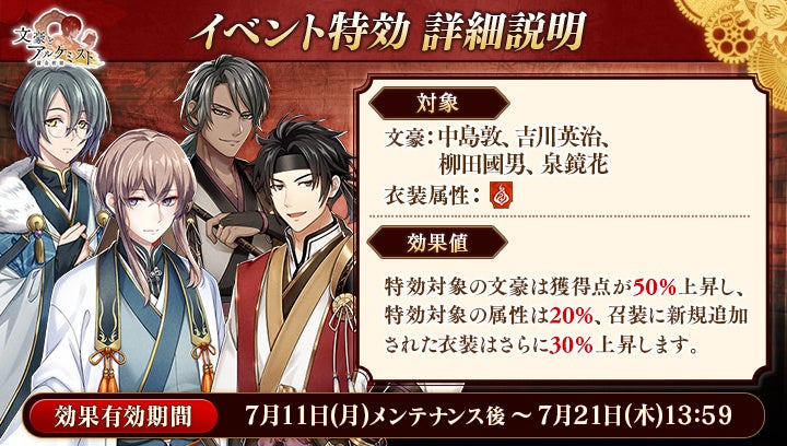 期間中「中島敦」「吉川英治」「柳田國男」「泉鏡花」の衣装を編成して潜書すると、得点の獲得数がそれぞれ50%上昇します。また、「火」属性の衣装を編成して潜書すると、得点の獲得数がそれぞれ20%上昇します。