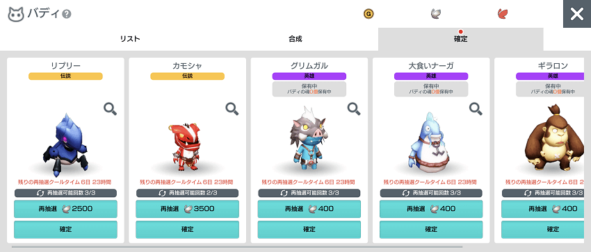 バディ合成で英雄等級以上のバディを獲得すると、同じ等級の別のバディにチェンジ、または確定獲得できるバディチェンジ(再抽選)システムが実装されました。お目当てのバディがなかなか手に入らない時などにぜひご活用ください。