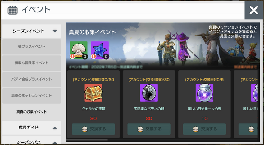 デイリーミッションをクリアして収集アイテム「五色真珠貝」と「夏のヒトデ」を集めましょう!集めた「五色真珠貝」と「夏のヒトデ」は各種アイテムと交換できます。交換できるアイテムには「[英雄]バディの卵」や「[超傑作]彫像選択ボックス」などの豪華アイテムをご用意しました!ぜひご参加ください。