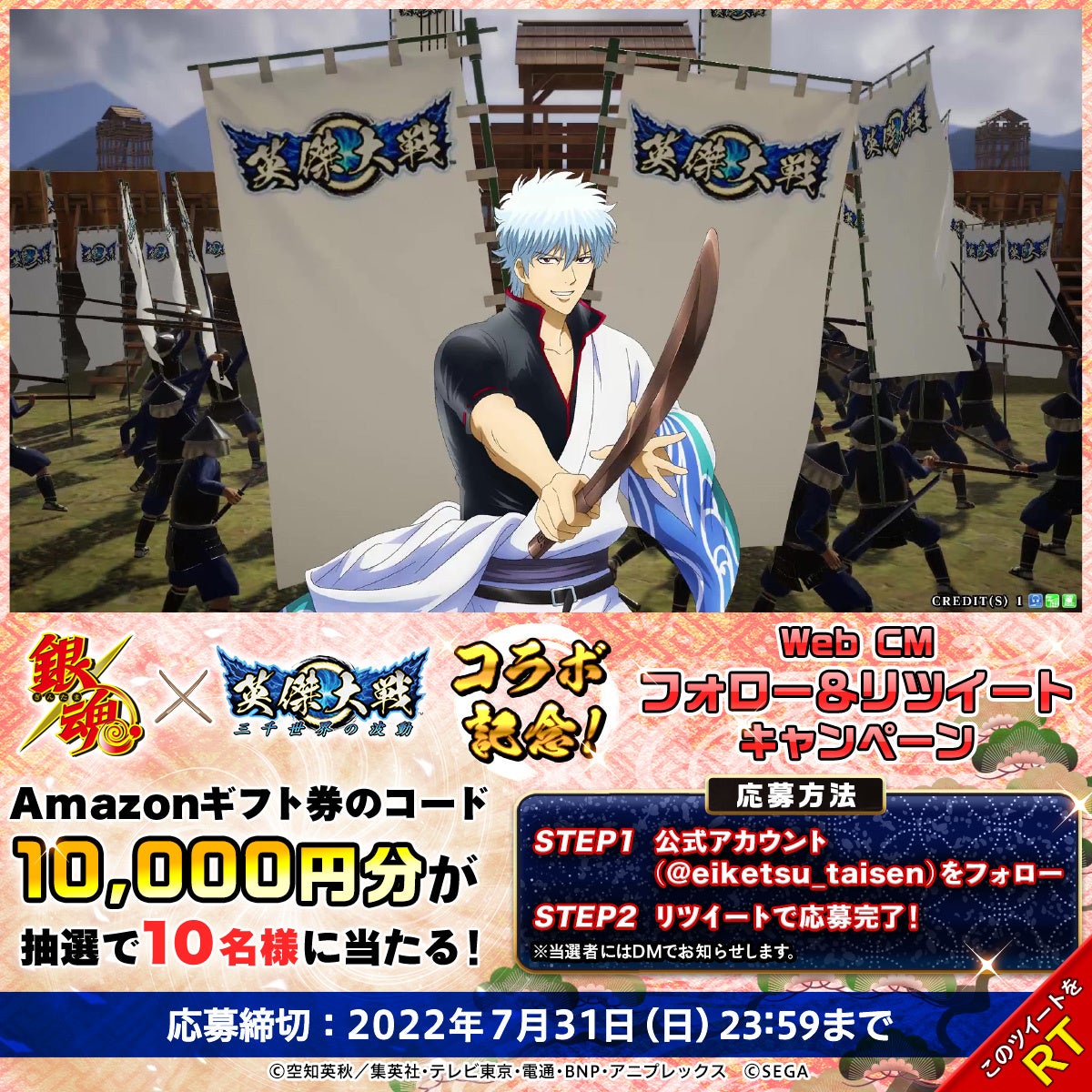 コラボを記念してWeb CMフォロー&リツイートキャンペーンを実施中。『英傑大戦』公式アカウントのをフォローしただき、キャンペーンツイートをRTいただくだけで応募完了。