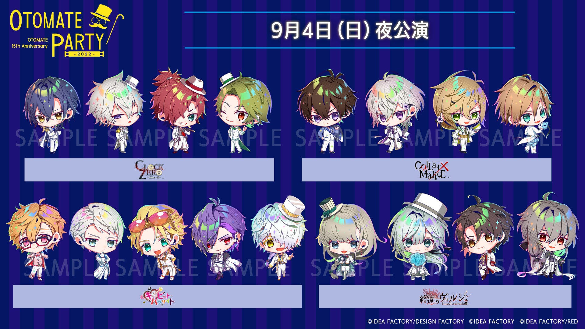 アイディアファクトリー株式会社の女性向けゲームブランド「オトメイト」は、2022年9月3日(土)・4日(日)開催予定『オトメイトパーティー2022』につきまして、本日7月13日(水)より1次プレオーダー先行抽選のチケット申込をスタートいたします。また、そちらに合わせて本イベント出演キャスト31名から頂いた一言メッセージのTwitter投稿企画を開始、ならびに描きおろしちびキャラを全種公開しております。