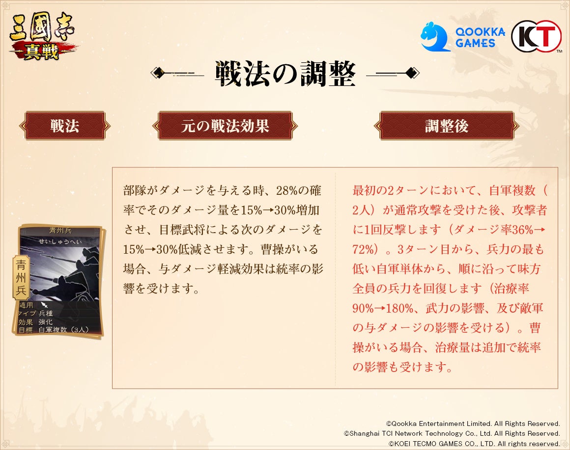 以上のように、最も変化が大きいのは、やはり「青州兵」だと言えるでしょう。リメイクされた青州兵の性能は大きく変化するため、使用している君主様は現在の編制を再検討する必要がありそうです。