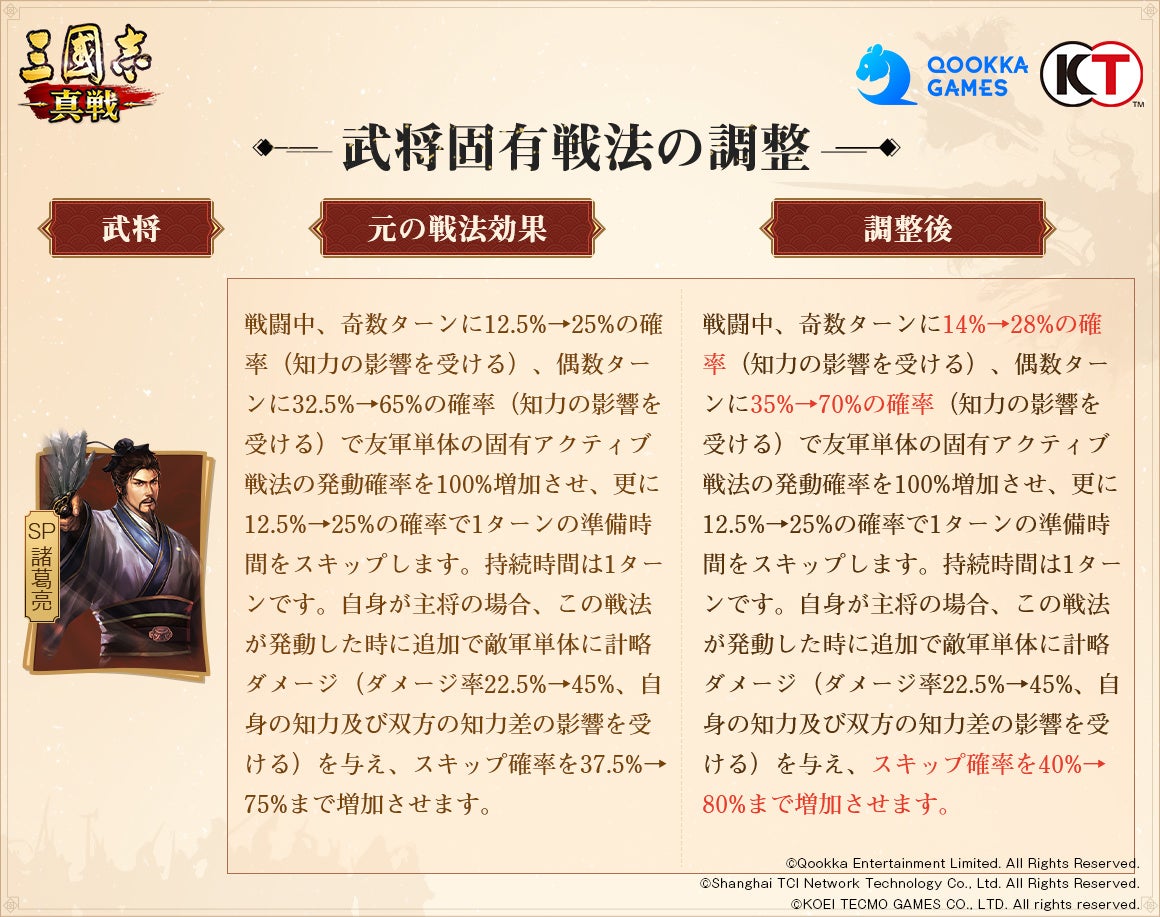 以上のように、調整後のSP諸葛亮は一層強くなりますので、これまで編制に入れていなかった君主様も、この機に使ってみてはいかがでしょうか?