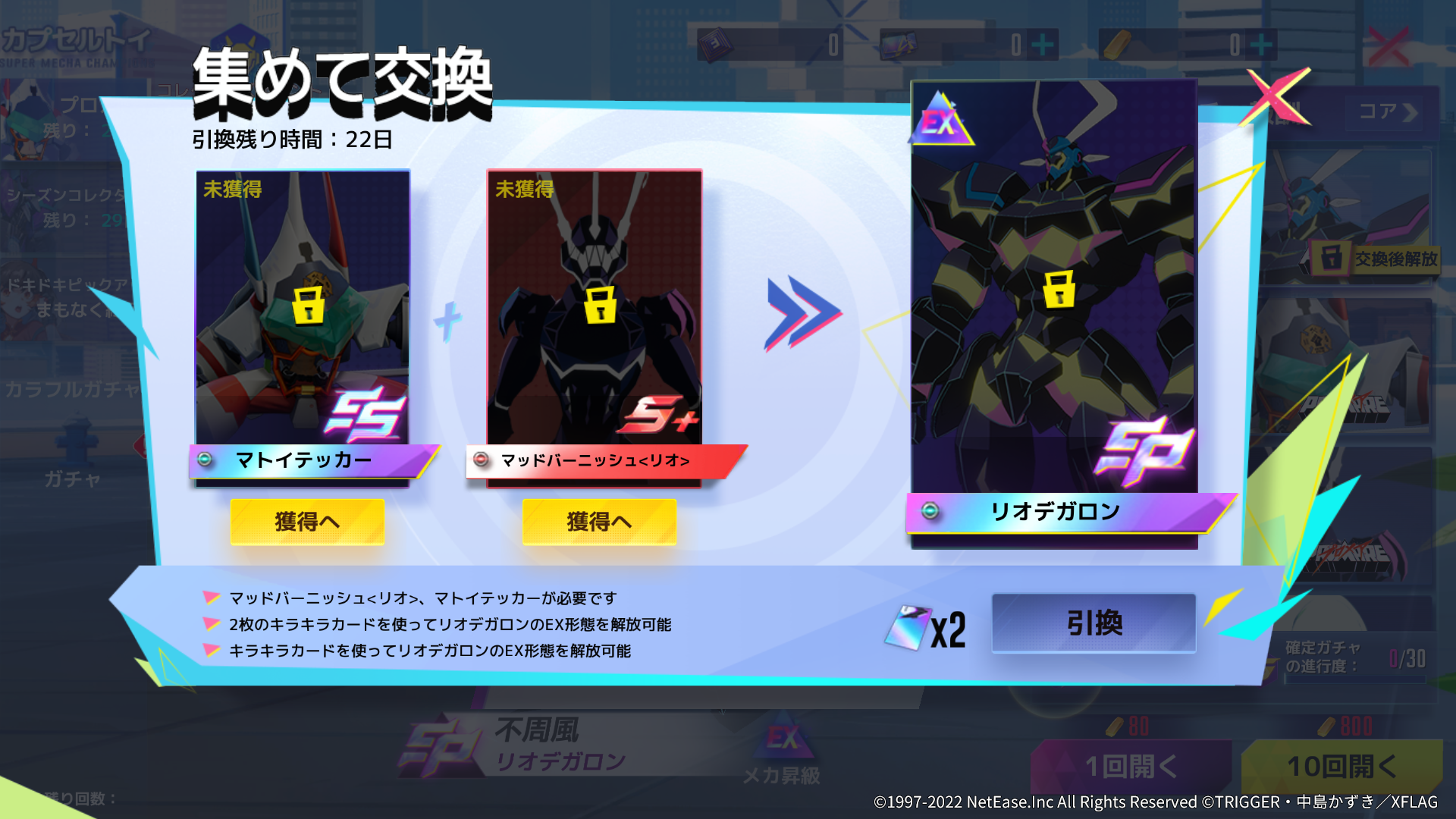 コラボイベント開始後、コラボコレクターズカプセルトイではガロ・ティモス、リオ・フォーティア、リオのS+スキン「マッドバーニッシュ<リオ>」、メカ「マトイテッカー」などが登場します。「マトイテッカー」と「マッドバーニッシュ<リオ>」を獲得後、さらに2枚のキラキラカードを消費すると、「リオデガロン」と交換できます。コラボ期間中、毎日ログインするとガチャでコレクターズギフト券を獲得できます(合計3日間)。