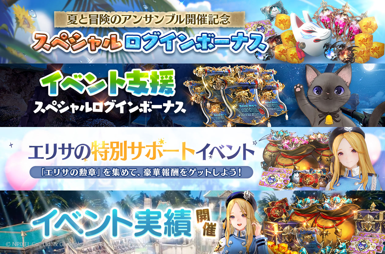 「夏と冒険のアンサンブル」開催を記念したスペシャルログインボーナスをはじめ、豪華報酬を入手できるイベントを多数開催しております!今年の夏はグランサガを遊びつくしましょう!