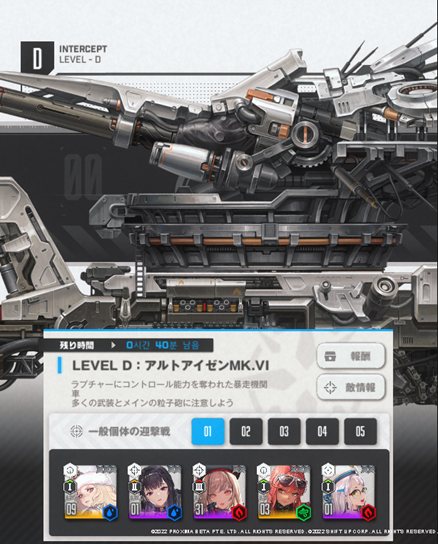 制限時間内に、ラプチャーにコントロールを奪われた暴走機関車を撃破しましょう。多くの武器とメインの粒子砲に気をつけてください!攻撃を避けて、ニケたちを交代させながら戦いましょう。迎撃戦をクリアすると、前期の戦闘に役立つアイテムが手に入ります。事前に確認できる敵の情報をしっかり確認しておくことが秘訣です。さあ、迎撃戦の始まりです!