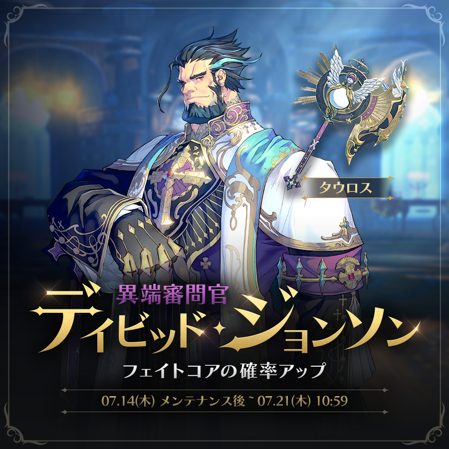 今回のアップデートでは、デイビッド・ジョンソンのフェイトコア「異端審問官_デイビッド・ジョンソン」が登場!確率アップ契約では、高級契約より高い確率で英雄を獲得できます。また、専用装備として「タウロス」もあわせて登場しております。この機会にぜひ手に入れてくださいね!