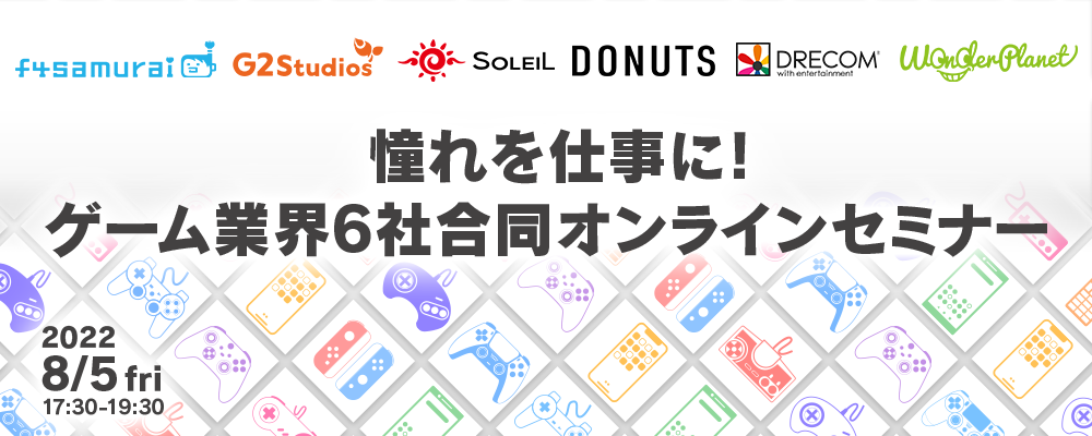 G2 Studios株式会社 (本社:東京都渋谷区、代表取締役社長:桜井 敦)は、株式会社f4samurai、ソレイユ株式会社、株式会社DONUTS、株式会社ドリコム、ワンダープラネット株式会社と合同で、ゲーム業界6社合同オンラインセミナーを8月5日(金)に開催することをお知らせします。本イベントは、ゲーム業界に興味がある学生を対象としたイベントです。6社の採用担当者が一堂に会し、ゲーム業界についての基本的な情報や各社の違いをお伝えすることで、ゲーム業界への理解を深め、今後の就職活動にお役立ていただけるような内容をお届けします。
