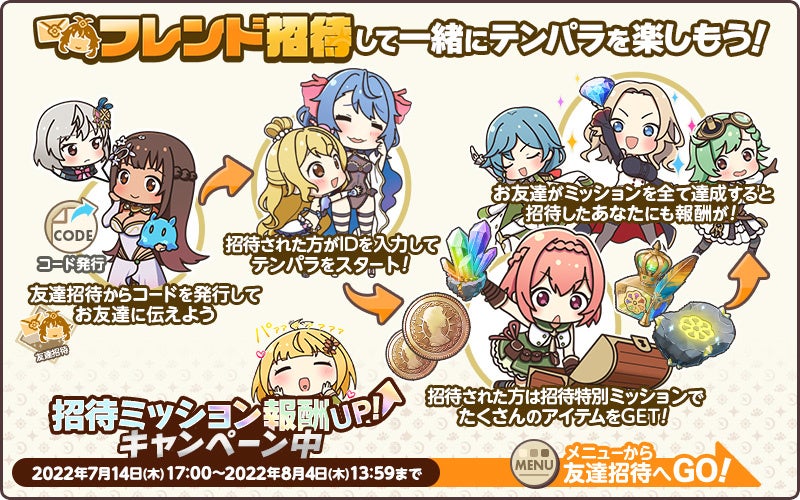 招待されたプレイヤーは招待特別ミッションが発生し、ミッションクリアでさまざまな報酬が獲得できます。すべてのミッションをクリアすると、招待したプレイヤーに今だけ最大ダイヤ3,000個のほか、豪華アイテムが報酬としてプレゼントされます。このミッションクリア時の報酬は期間限定での増量となっております。ぜひこの機会に友達同士でテンパラをプレイしよう!