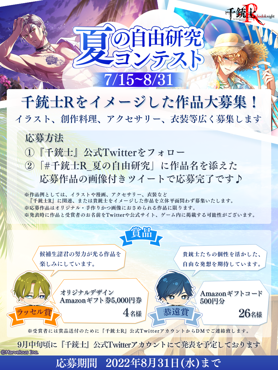 株式会社マーベラス(代表取締役社長:佐藤 澄宣/所在地:東京都品川区)による、スマートフォンゲーム『千銃士:Rhodoknight』(読み:せんじゅうし ろーどないと 以降、『千銃士R』)は、ゲーム内外で開催中の夏休みスペシャルキャンペーンの第3弾として、Twitterにて「千銃士R をイメージしたオリジナル・手作り作品」を募集する「千銃士R 夏の自由研究コンテスト」を開始いたしました。