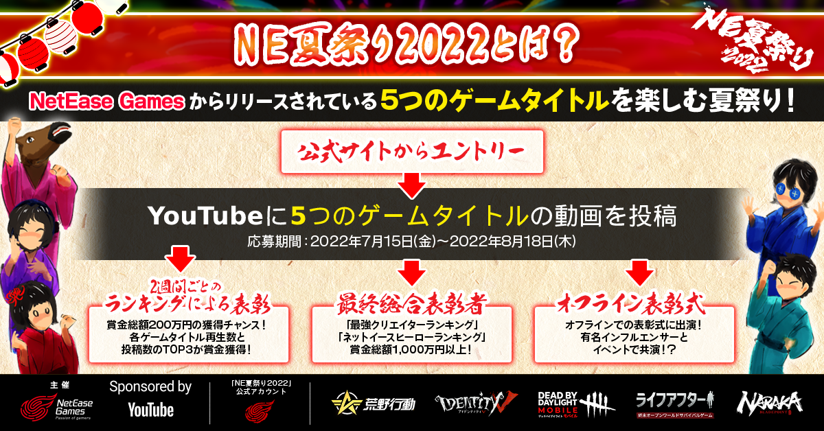 2022年7月15日~8月27日の期間中に開催される「NE夏祭り2022」は、NetEase Gamesが誇る人気タイトルを題材にした動画をYouTubeにて投稿し、その再生回数や投稿本数を競うイベントです。