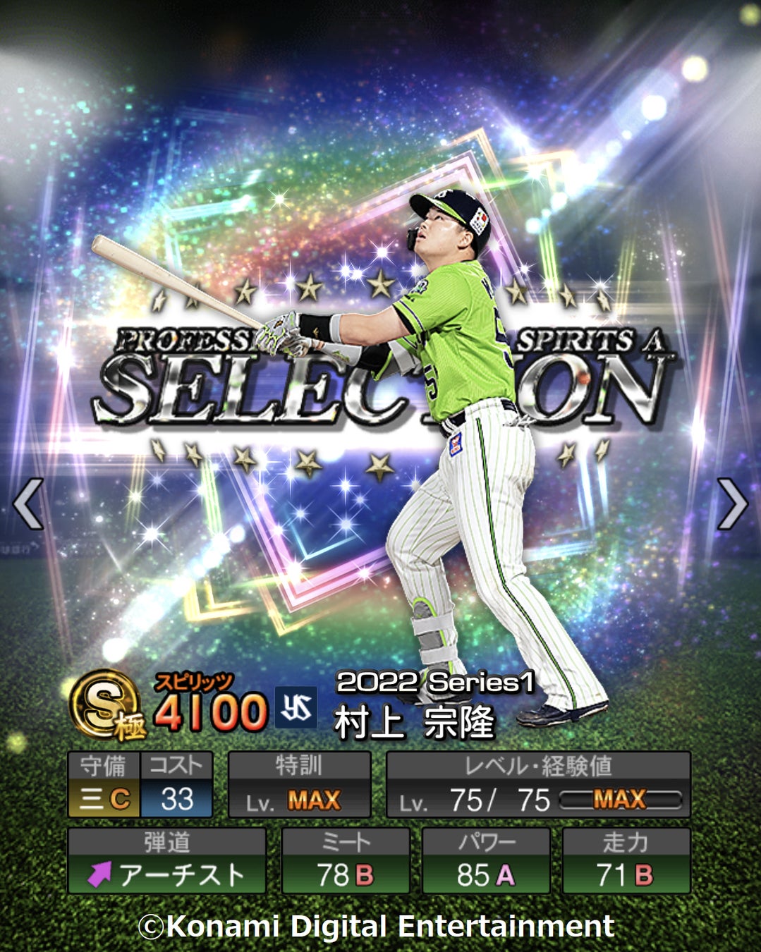 第1弾の「2022 プロスピセレクション」には、ヤクルトの若き主砲・村上宗隆選手や巨人の新守護神・大勢らプロ野球前半で活躍した選手たちが期間限定で登場します。最大スピリッツ4100の選手たちをゲットして、チームを育成できます。